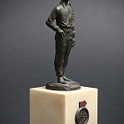 The sculpture depicts the pilot standing proudly, wearing his racing overalls and aviator helmet with goggles, captured in a moment of calm determination before the race. The expressive modeling of the face and the finely detailed folds of the clothing convey both strength and elegance, reflecting the spirit of a true racing legend.