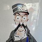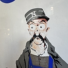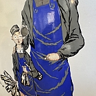 Illustration of the delivery man Nectar, moustached, wearing a blue apron